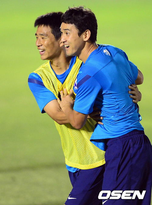 5일 오후(현지시각) 카타르 도하 카타르축구협회 테크니컬센터에서 열린 대표팀 훈련에서 오범석과 이정수가 몸싸움을 하고 있다.
