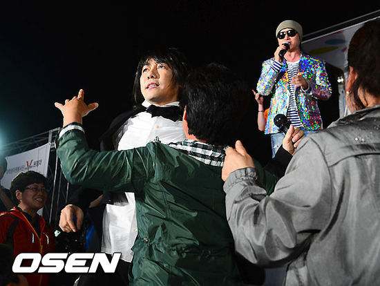 5일 오후 인천 옹진군 연평면 종합운동장에서 진행된 '김장훈과 V원정대가 부르는 희망의 노래-연평 아리랑 프로젝트 2탄'에서 김장훈이 연평도주민과 춤을 추고 있다.