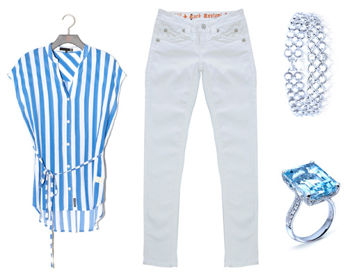 화이트 데님 팬츠와 블루 컬러의 스트라이프 블라우스를 함께 매치한다면 시크하면서도 시원한 분위기의 오피스룩을 연출할 수 있다. 이때 조그마한 포인트로 반짝이는 화이트 골드 브레이슬릿과 아쿠아 블루 링 등의 액세서리로 마무리한다면, 여름철 오피스룩을 완성 할 수 있다.