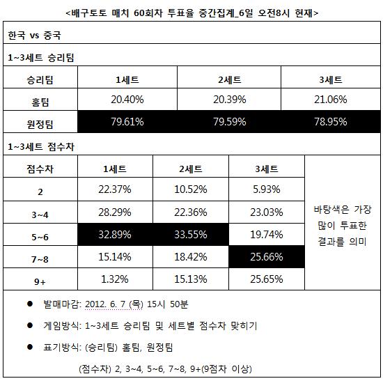 [배구토토] 국민체육진흥공단(www.kspo.or.kr)이 발행하는 체육진흥투표권 수탁사업자인 스포츠토토 공식 온라인 발매사이트 베트맨(www.betman.co.kr)이 오는 7일 오후 4시 일본 도쿄에서 열리는 2012 런던올림픽 남자배구 세계예선전 한국-중국전 대상 배구토토 매치 60회차 게임 투표율을 중간집계한 결과, 국내 배구팬들은 중국이 한국을 상대로 승리할 것으로 예상했다고 밝혔다.