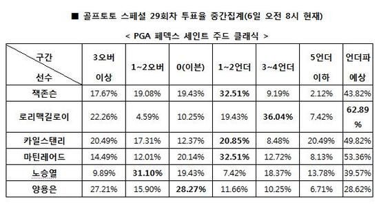 맥길로이 외에 마틴 레어드(53.36%)의 언더파 예상이 높게 집계된 반면, 카일 스탠리(49.82%), 잭존슨(43.82%), 노승열(39.57%), 양용은(28.62%)의 1라운드 언더파 예상은 비교적 낮게 나타났다.