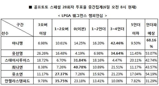 야니 챙에 이어 유소연(54.19%), 유선영(53.07%)의 언더파 활약이 예상된 반면, 최나연(43.57%), 스테이시 루이스(42.74%), 안젤라 스탠퍼드(31.29%)의 1라운드 언더파 예상은 비교적 낮게 나타났다.