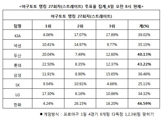 국민체육진흥공단(www.kspo.or.kr)이 발행하는 체육진흥투표권 수탁사업자인 스포츠토토 공식 온라인 발매 사이트인 베트맨(www.betman.co.kr)이 오는 7일 오후 6시 30분에 열리는 2012 프로야구 4경기 8개팀을 대상으로 한 야구토토 랭킹 27회차 스트레이트 게임을 중간집계한 결과, 참가자들은 한화(46.59%), 롯데(43.22%), 두산(40.13%) 순으로 다득점 상위 3개팀을 꼽았다. 반면 LG(34.32%)와 SK(25.11%)는 가장 적은 득점을 기록할 것으로 예상됐다.
