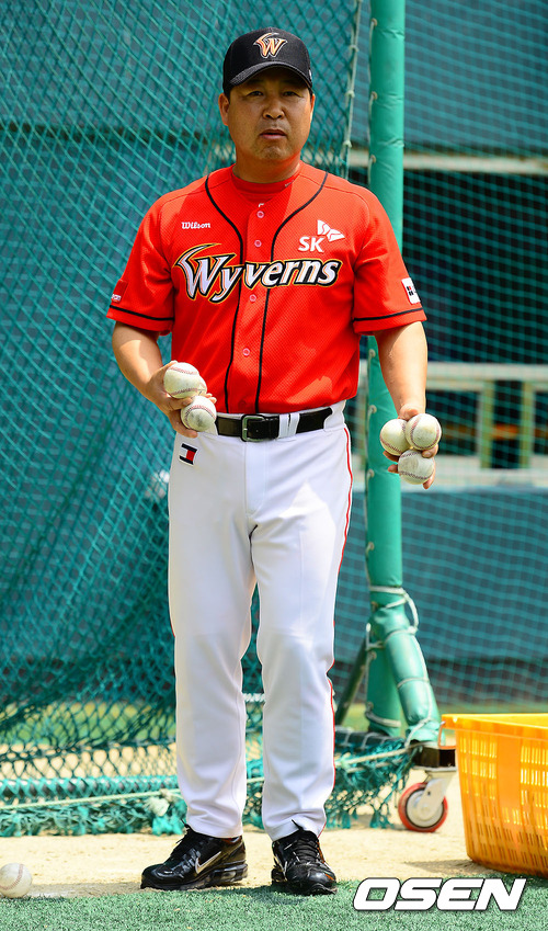 6일 오후 서울 잠실구장에서 열리는 2012 팔도 프로야구 두산 베어스와 SK 와이번스의 경기 전 SK 이만수 감독이 배팅볼을 던지기 위해 공을 들었다. 하지만 선수들이 아무도 오지 않자 당황해 하고 있다.