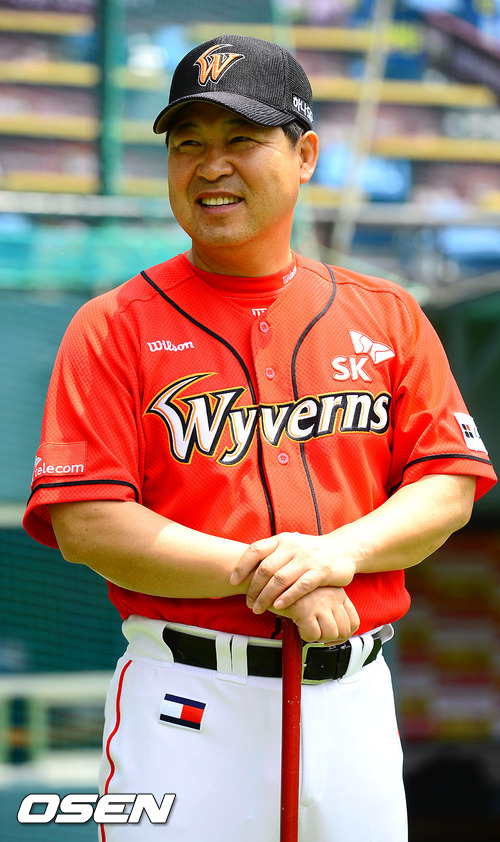 6일 오후 서울 잠실구장에서 열리는 2012 팔도 프로야구 두산 베어스와 SK 와이번스의 경기 전 SK 이만수 감독이 미소 짓고 있다