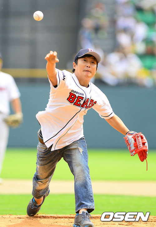 6일 오후 서울 잠실구장에서 열린 2012 팔도 프로야구 두산 베어스와 SK 와이번스의 경기 전 개그맨 이수근이 시구를 하고 있다