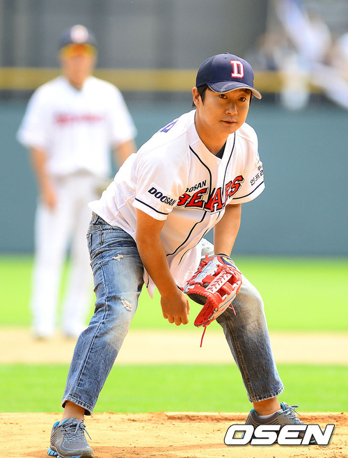 6일 오후 서울 잠실구장에서 열린 2012 팔도 프로야구 두산 베어스와 SK 와이번스의 경기 전 개그맨 이수근이 시구를 하고 있다