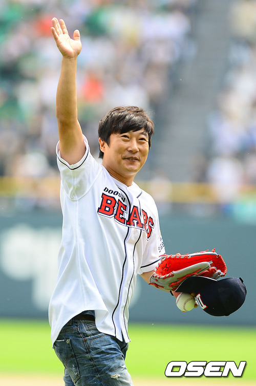6일 오후 서울 잠실구장에서 열린 2012 팔도 프로야구 두산 베어스와 SK 와이번스의 경기 전 개그맨 이수근이 시구를 마친후 팬들에게 인사를 하고 있다