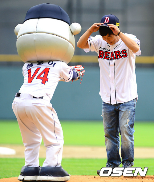 6일 오후 서울 잠실구장에서 열린 2012 팔도 프로야구 두산 베어스와 SK 와이번스의 경기 전 개그맨 이수근이 두산 마스코트 철웅이에게 글러브를 받고 있다