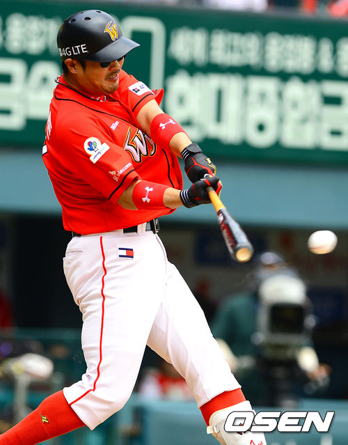6일 오후 서울 잠실구장에서 열린 2012 팔도 프로야구 두산 베어스와 SK 와이번스의 경기 1회초 2사 2루 SK 이호준이 선취 1타점 적시타를 날리고 있다.