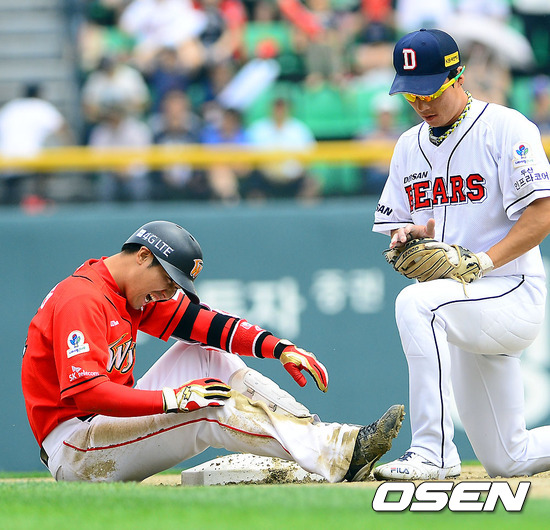 6일 오후 서울 잠실구장에서 열린 2012 팔도 프로야구 두산 베어스와 SK 와이번스의 경기 1회초 2사 2루타를 친 최정이 두산 고영민과 충돌한 후 고통스러워하고 있다.