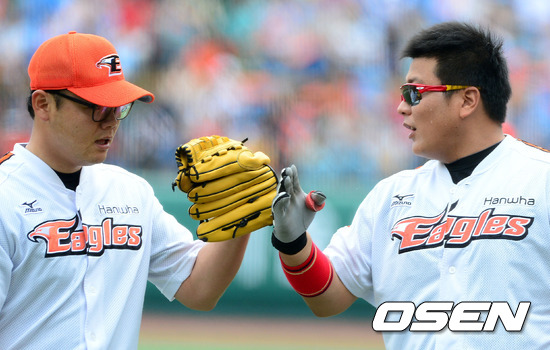 현충일인 6일 오후 대전구장에서 열린 '2012 팔도 프로야구' 한화 이글스와 롯데 자이언츠의 경기, 1회초 수비를 마친 한화 송창식이 김태균의 격려를 받으며 더그아웃으로 향하고 있다.