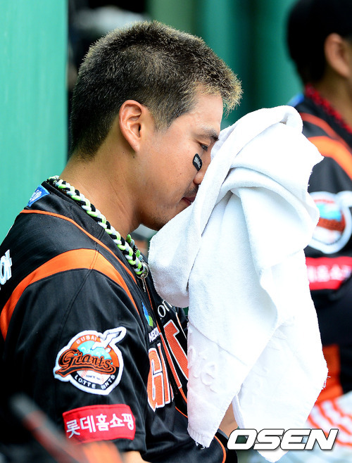 현충일인 6일 오후 대전구장에서 열린 '2012 팔도 프로야구' 한화 이글스와 롯데 자이언츠의 경기, 1회말 롯데 홍성흔이 더그아웃에 앉아 땀을 닦고 있다.
