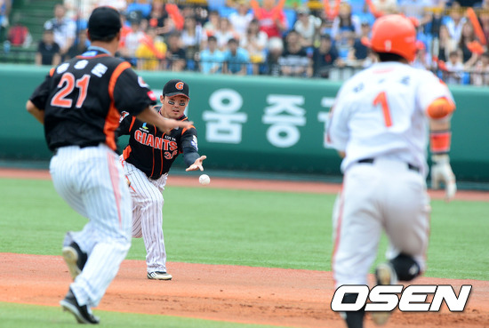 현충일인 6일 오후 대전구장에서 열린 '2012 팔도 프로야구' 한화 이글스와 롯데 자이언츠의 경기, 1회말 2사에서 롯데 박종윤이 한화 장성호의 내야땅볼을 잡아 1루 베이스커버 들어 온 송승준에 토스하고 있다.