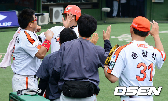 현충일인 6일 오후 대전구장에서 열린 '2012 팔도 프로야구' 한화 이글스와 롯데 자이언츠의 경기, 2회말 2사 1,3루에서 한화 최진행이 오선진의 선제 적시타에 홈을 밟고 김태균의 축하를 받고 있다.