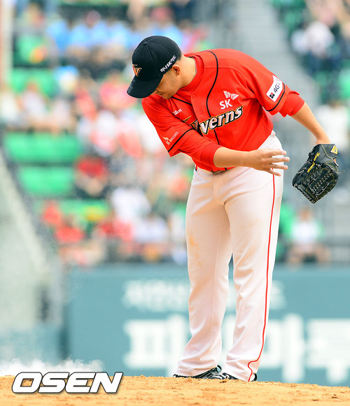 6일 오후 서울 잠실구장에서 열린 2012 팔도 프로야구 두산 베어스와 SK 와이번스의 경기 1회말 SK 선발투수 마리오가 로진백을 마운드에 던지고 있다.