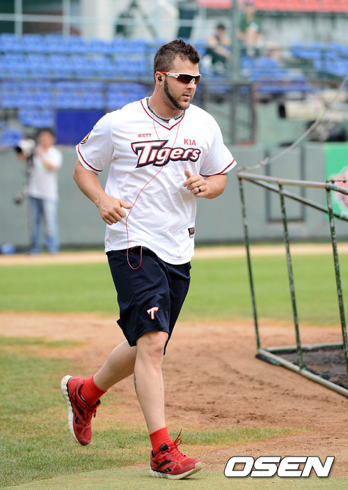 6일 오후 광주 무등야구장에서 열린 '2012 팔도 프로야구' KIA 타이거즈와 삼성 라이온즈의 경기에 앞서 KIA 앤서니가 훈련을 하고 있다.