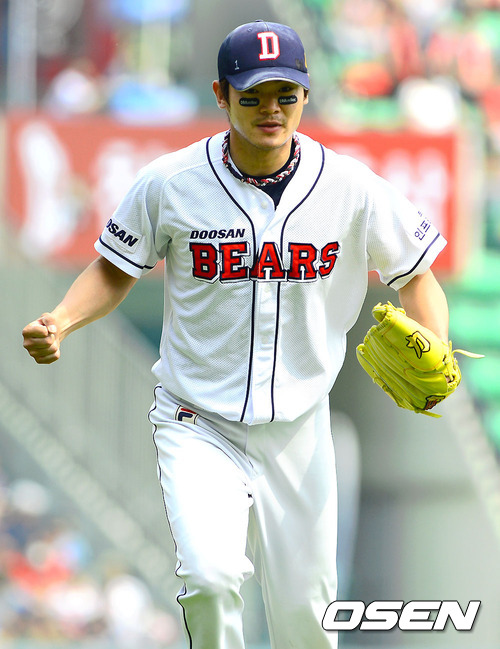 6일 오후 서울 잠실구장에서 열린 2012 팔도 프로야구 두산 베어스와 SK 와이번스의 경기 5회초 2사 1루 SK 안치용을 삼진아웃 잡은 두산 선발투수 노경은이 주먹을 쥐며 환호하고 있다