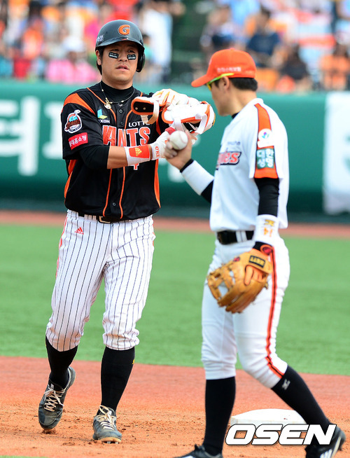 현충일인 6일 오후 대전구장에서 열린 '2012 팔도 프로야구' 한화 이글스와 롯데 자이언츠의 경기, 4회초 1사 2루에서 롯데 강민호가 동점 적시타를 날리고 타임을 외치고 있다.
