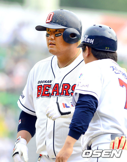 6일 오후 서울 잠실구장에서 열린 2012 팔도 프로야구 두산 베어스와 SK 와이번스의 경기 6회말 2사 1,2루 두산 최준석이 동점 적시타를 날린 후 전형도 코치와 하이파이브를 하고 있다