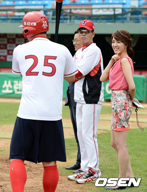 6일 오후 광주 무등야구장에서 열린 '2012 팔도 프로야구' KIA 타이거즈와 삼성 라이온즈의 경기에 앞서 정지원 KBS 아나운서가 KIA 이범호와 이야기를 하고 있다.