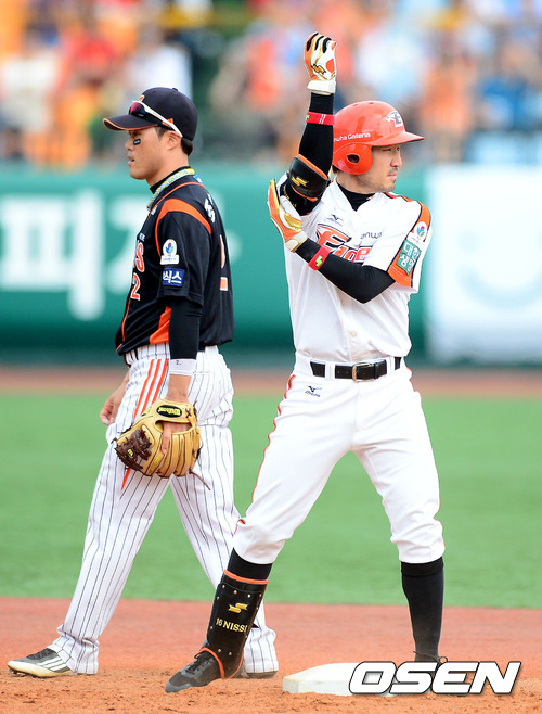 현충일인 6일 오후 대전구장에서 열린 '2012 팔도 프로야구' 한화 이글스와 롯데 자이언츠의 경기, 5회말 1사 1루에서 한화 한상훈이 1타점 적시 2루타를 날리고 타임을 외치고 있다.