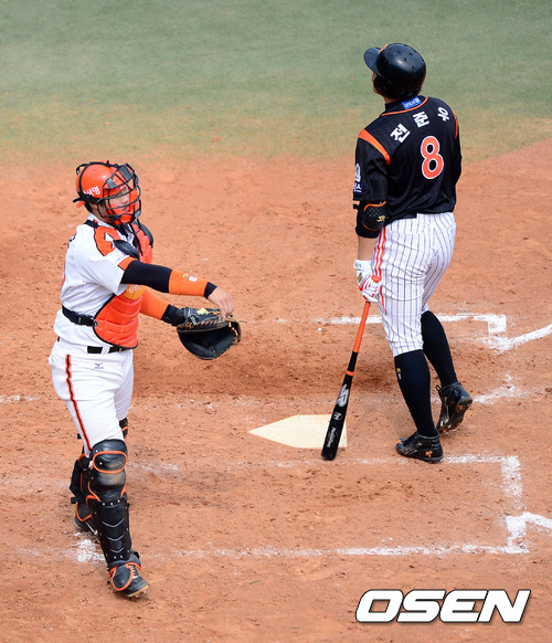 현충일인 6일 오후 대전구장에서 열린 '2012 팔도 프로야구' 한화 이글스와 롯데 자이언츠의 경기, 5회초 2사 2루에서 롯데 전준우가 삼진으로 물러나고 있다.