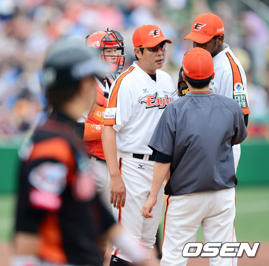 현충일인 6일 오후 대전구장에서 열린 '2012 팔도 프로야구' 한화 이글스와 롯데 자이언츠의 경기, 6회초 1사 1루에서 한화 바티스타가 롯데 강민호에 볼넷을 허용하자 정민철 투수코치가 마운드에 올라 강판시키고 있다.