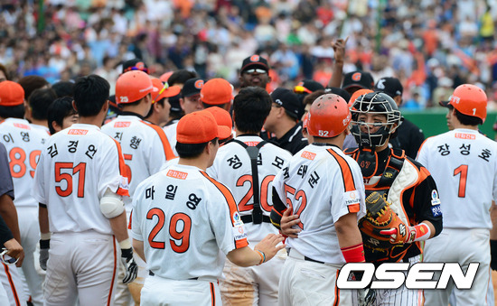 현충일인 6일 오후 대전구장에서 열린 '2012 팔도 프로야구' 한화 이글스와 롯데 자이언츠의 경기, 7회말 2사에서 롯데 김성배가 한화 김태균에 빈볼을 던져 벤치 클리어링 사태가 벌어졌다. 강민호가 김태균을 말리고 있다.