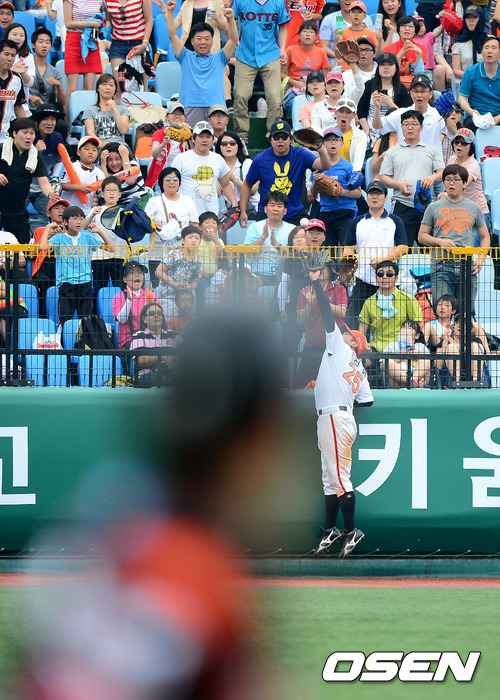 현충일인 6일 오후 대전구장에서 열린 '2012 팔도 프로야구' 한화 이글스와 롯데 자이언츠의 경기, 8회초 무사에서 한화 최진행이 롯데 강민호의 홈런성 타구를 점프하며 잡아내고 있다.