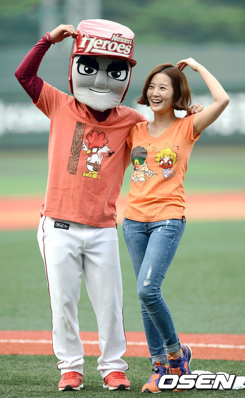 6일 오후 서울 목동야구장에서 열린 '2012 팔도 프로야구' 넥센 히어로즈와 LG 트윈스의 경기전 임정은이 턱돌이와 커플티를 입고 손으로 하트를 그리고 있다.