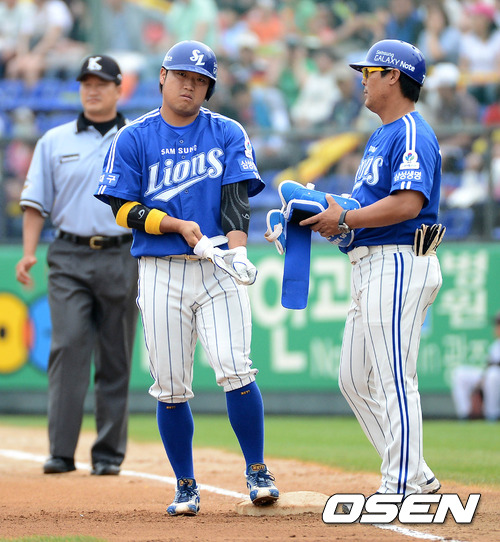 6일 오후 광주 무등야구장에서 열린 '2012 팔도 프로야구' KIA 타이거즈와 삼성 라이온즈의 경기, 1회초 2사 1,2루 삼성 박석민이 1타점 좌전 선제 적시타를 치고 팔꿈치 보호대를 벗고 있다.