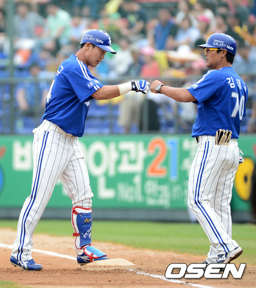 6일 오후 광주 무등야구장에서 열린 '2012 팔도 프로야구' KIA 타이거즈와 삼성 라이온즈의 경기, 1회초 2사 1,2루 삼성 강봉규가 1타점 중전 적시타를 치고 김태균 코치와 하이파이브를 하고 있다.