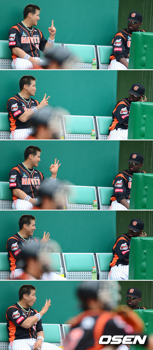 경기중 롯데 홍성흔이 유먼에게 손가락으로 한글 공부를 시키고 있다. /jpnews@osen.co.kr