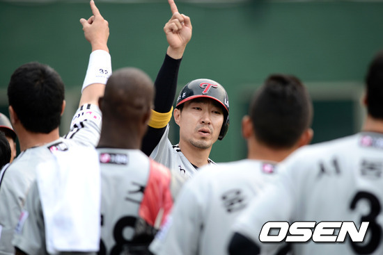 6일 오후 서울 목동야구장에서 열린 '2012 팔도 프로야구' 넥센 히어로즈와 LG 트윈스의 경기, 3회초 2사 1,2루 LG 정성훈이 우측 담장을 넘기는 3점 홈런을 치고 덕아웃에서 선수들과 기뻐하고 있다.