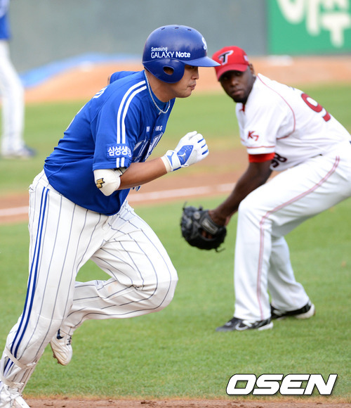 6일 오후 광주 무등야구장에서 열린 '2012 팔도 프로야구' KIA 타이거즈와 삼성 라이온즈의 경기, 4회초 무사 1,2루 삼성 박한이가 희생 번트를 치고 1루로 달리고 있다.