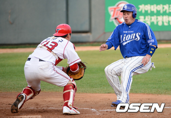 6일 오후 광주 무등야구장에서 열린 '2012 팔도 프로야구' KIA 타이거즈와 삼성 라이온즈의 경기, 5회초 2사 1루 삼성 김상수의 좌전 안타때 1루주자 진갑용이 홈으로 쇄도하고 있다.