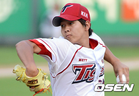 6일 오후 광주 무등야구장에서 열린 '2012 팔도 프로야구' KIA 타이거즈와 삼성 라이온즈의 경기, 6회초 KIA 김희걸과 교체된 임기준이 힘차게 공을 던지고 있다.