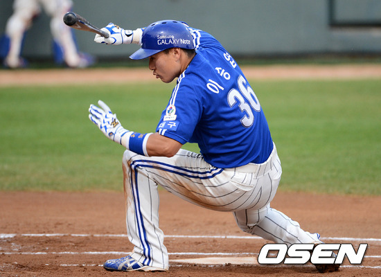 6일 오후 광주 무등야구장에서 열린 '2012 팔도 프로야구' KIA 타이거즈와 삼성 라이온즈의 경기, 6회초 1사 1,2루 삼성 이승엽이 KIA 임기준의 몸쪽공에 놀라 넘어지고 있다.