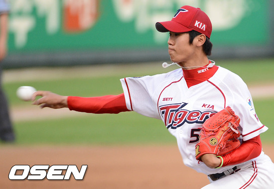 6일 오후 광주 무등야구장에서 열린 '2012 팔도 프로야구' KIA 타이거즈와 삼성 라이온즈의 경기, 6회초 1사 만루 KIA 임기준과 교체된 홍성민이 힘차게 공을 던지고 있다.