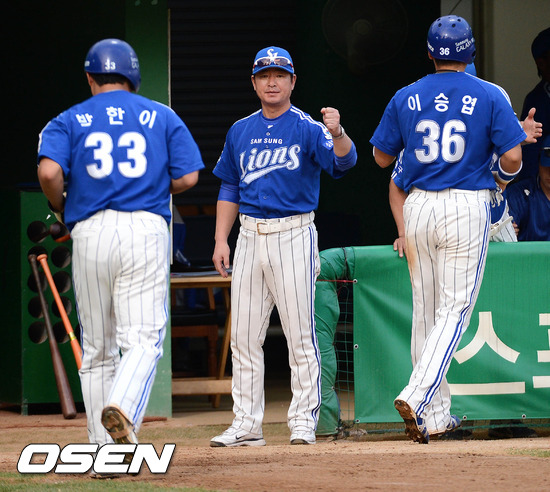 6일 오후 광주 무등야구장에서 열린 '2012 팔도 프로야구' KIA 타이거즈와 삼성 라이온즈의 경기, 6회초 1사 만루 삼성 박석민의 싹쓸이 2루타때 류중일 감독이 더그아웃에서 홈을 밟은 1루주자 이승엽과 2루주자 박한이를 축하하고 있다.