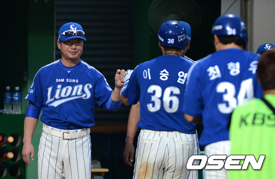 6일 오후 광주 무등야구장에서 열린 '2012 팔도 프로야구' KIA 타이거즈와 삼성 라이온즈의 경기, 8회초 무사 1루 삼성 이승엽이 좌월 투런 홈런을 치고 더그아웃에서 류중일 감독의 축하를 받고 있다.
