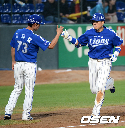 6일 오후 광주 무등야구장에서 열린 '2012 팔도 프로야구' KIA 타이거즈와 삼성 라이온즈의 경기, 8회초 무사 1루 삼성 이승엽이 좌월 투런 홈런을 치고 김재걸 코치와 하이파이브를 하고 있다.