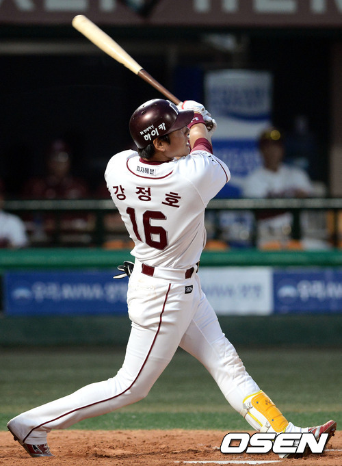 6일 오후 서울 목동야구장에서 열린 '2012 팔도 프로야구' 넥센 히어로즈와 LG 트윈스의 경기, 8말 무사 넥센 강정호가 좌측담장을 넘기는 솔로 홈런을 치고 있다.
