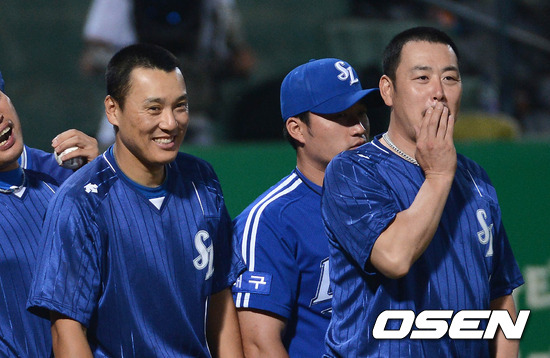 경기 종료 후 삼성 이승엽과 진갑용이 미소를 짓고 있다./ sunday@osen.co.kr