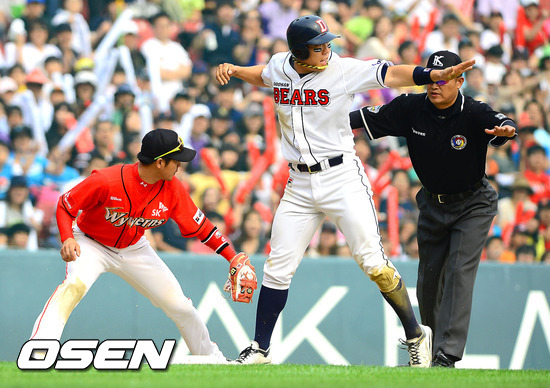 야구팬이라면 누구나 알고 있는 너무도 당연한 얘기로, 이 조항의 핵심은 ‘주자가 루에 닿기 전’이라는 부분이다. 주자가 루에 도착하기 전에 공이 먼저 오면 당연히 그 주자는 아웃임을 규정하고 있다. 하지만 규칙집 어디를 뒤져봐도 주자와 송구가 동시에 도착했을 경우에 관한 설명은 찾을 수가 없다.