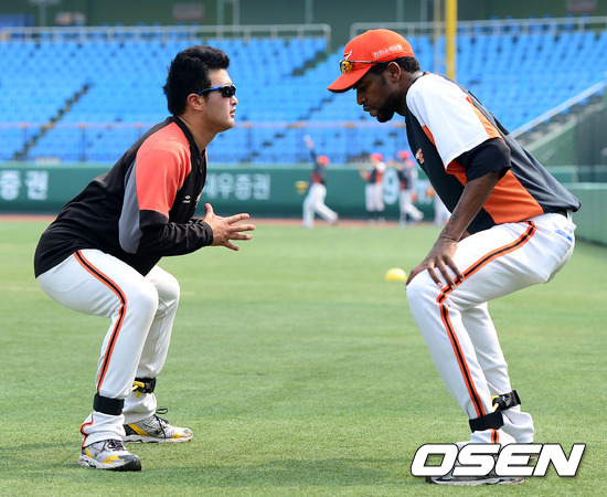 7일 오후 대전구장에서 열린 '2012 팔도 프로야구' 한화 이글스와 롯데 자이언츠의 경기, 경기전 한화 안승민과 바티스타가 스트레칭을 하며 몸을 풀고 있다.