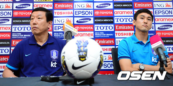 7일 오전(현지시각) 카타르 도하 알 사드 스타디움에서 열린 대표팀 기자회견에서 최강희 감독과 이정수가 취재진들과 질의응답 시간을 갖고 있다.