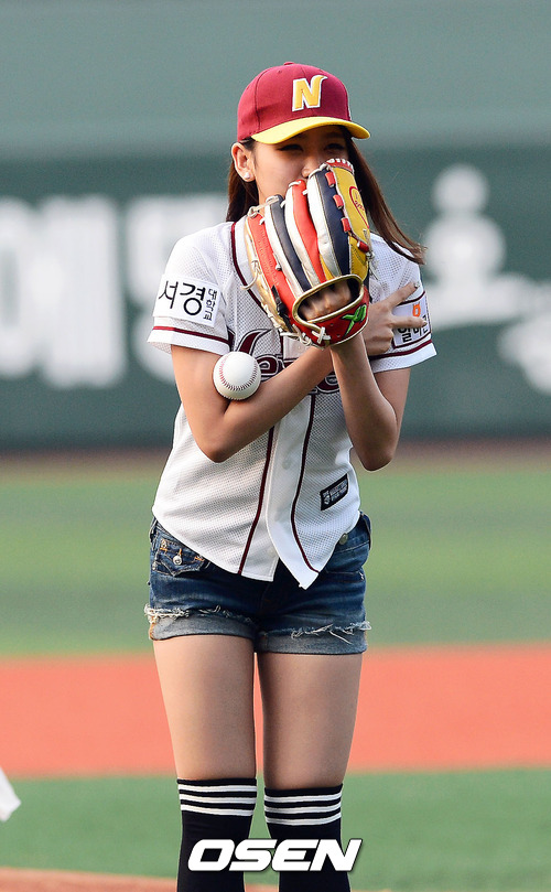 7일 오후 서울 목동구장에서 열린 2012 팔도 프로야구 넥센 히어로즈와 LG 트윈스와의 경기에 앞선 승리기원 시구에서 걸그룹 헬로비너스의 유영이 사인을 보내는중 글러브에서 공이 빠져나오고 있다.