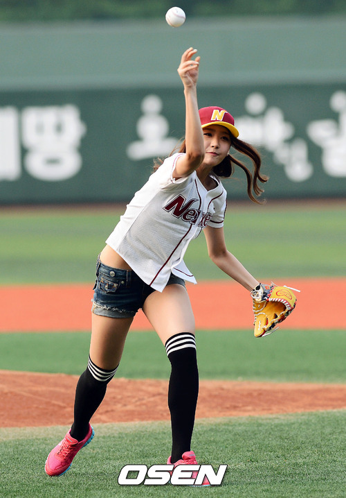 7일 오후 서울 목동구장에서 열린 2012 팔도 프로야구 넥센 히어로즈와 LG 트윈스와의 경기에 앞선 승리기원 시구행사에서 걸그룹 헬로비너스 유영이 시구를 하고 있다.